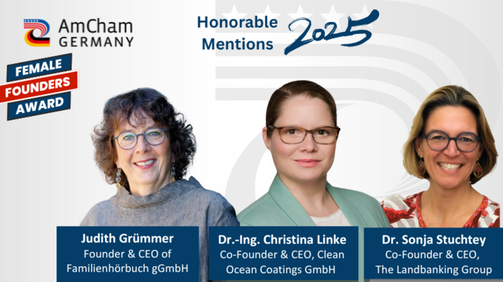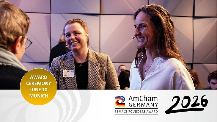In 2026, the American Chamber of Commerce in Germany (AmCham Germany) will present its Female Founders Award (FFA) for the 7th time. The Award Ceremony will take place on June 10, 2026 in Munich. Two female (co-)founders will receive the award to celebrate their achievements and elevate their visibility across the AmCham Germany network. Launched in 2019 by AmCham Germany, the Female Founders Award aims to set an example and honor successful female founders as positive role models, as women are still a minority in the start-up ecosystem on both sides of the Atlantic. The award brings together the values of the American entrepreneurial spirit, German entrepreneurship as well as the activities of AmCham Germany under the context of entrepreneurship and women in leadership.