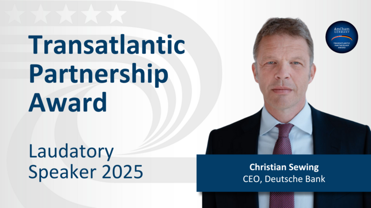 The laudatory speech at this year's Transatlantic Partnership Award Ceremony will be held by Christian Sewing, CEO of Deutsche Bank.