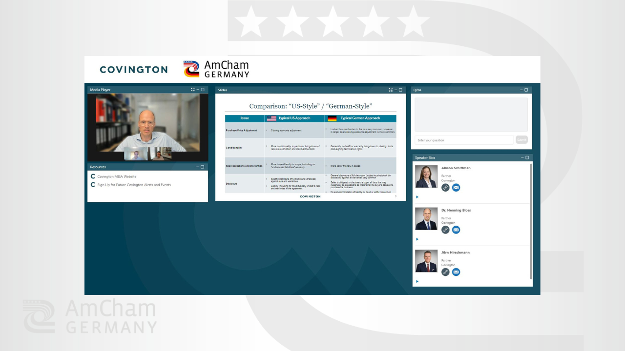 The main part of the webinar focused on the comparison of U.S. and German style M&A. This included the specifics and differences in terms of e.g. purchase price adjustments, representations and warranties, conditionality, disclosure, liability limitations on general warranty breaches, W&I insurance, and escrow. In order to illustrate the topics in the best possible way, this was underpinned with experiences and examples from practice.
