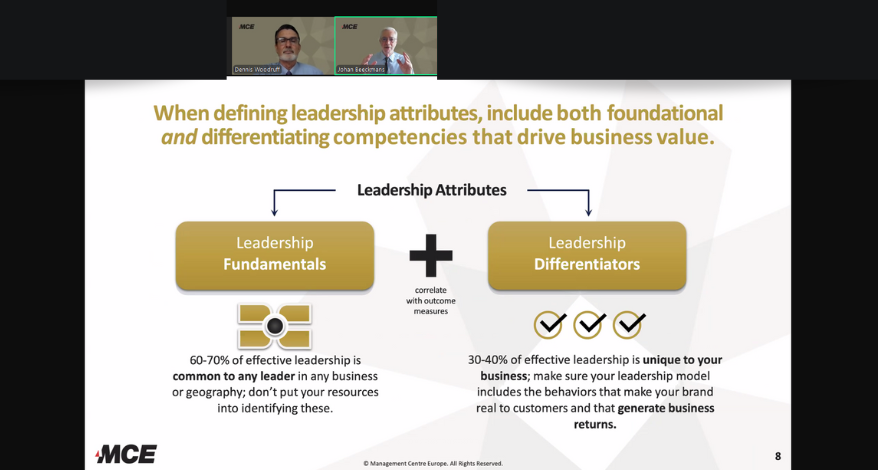 The speakers Johan Beeckmans and Dennis Woodruff have done significant global research in leadership over the last 20 years in Fortune 500 companies. Together, they have covered 57 countries. Both Johan and Dennis facilitate MCE programs around the globe. They share both their international business experience and the outcomes of their research with participants attending these development programs.