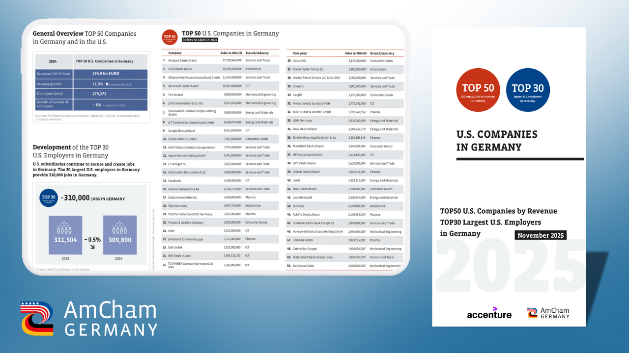 Each year, AmCham Germany releases its ranking of the TOP 50 U.S. companies in Germany and the TOP 30 largest U.S. employers in Germany. The TOP 50 ranking lists the largest companies with more than 50% U.S. capital in Germany in terms of revenue. It refers to the 2024 fiscal year. The revenue and employee figures are partially derived from estimates prepared exclusively by AmCham Germany and Accenture.