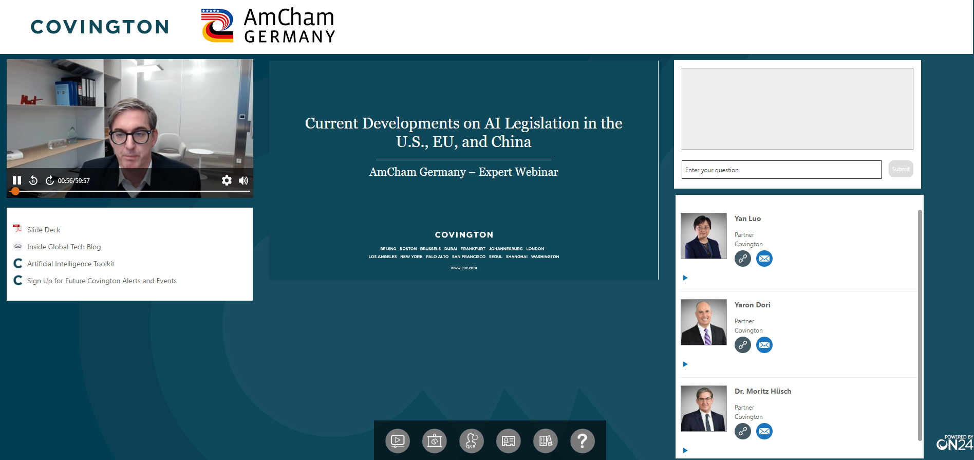 On December 12, 2023, AmCham Germany, in cooperation with Covington & Burling, hosted an Expert Webinar on “Recent Developments in AI Legislative Initiatives in the U.S., EU and China.” Dr. Moritz Hüsch, Partner at Covington & Burling in Frankfurt, kicked off the Expert Webinar with a snapshot of headlines from the press on AI risks, threats and concerns that come along with artificial intelligence applications. So far, the EU, U.S. and China have taken differing approaches towards AI legislation.