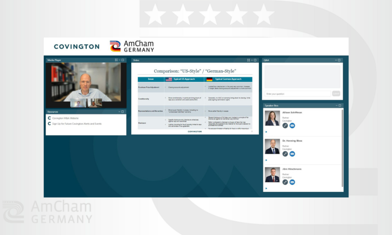 On June 27, AmCham Germany and Covington hosted an Expert Webinar on "U.S. Cross-Border M&A" with lawyers Allison Schiffman (New York), Henning Bloss, and Jörn Hirschmann (both Frankfurt) presenting trends and insights into cross-border M&A transactions from both sides of the Atlantic.